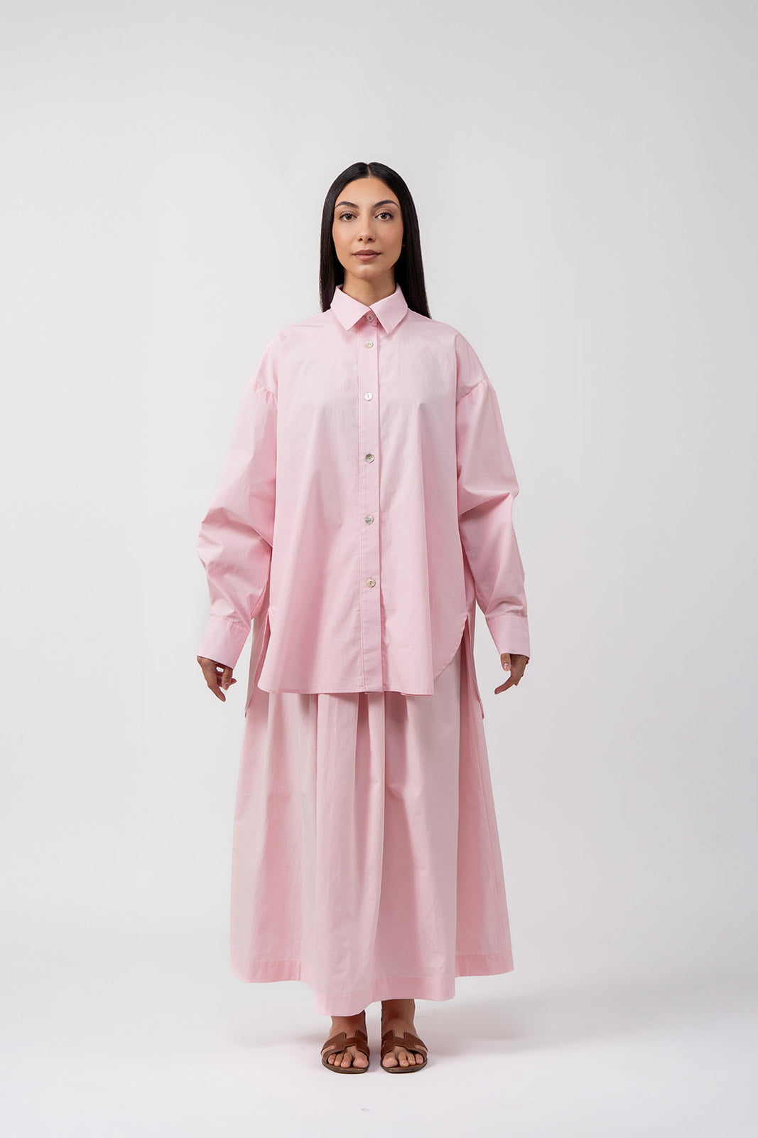 Tento set košile se sukní je ideální pro ty, kdo hledají sofistikovaný a pohodlný outfit. Košile s volným oversize střihem je vyrobena z luxusního bavlněného saténu, má dlouhé rukávy a zapínání na perleťové knoflíky. Sukně má délku je kotníkům, se širšími sklady, které dodávají celkovému vzhledu vzdušnost a eleganci. Tento set je dokonalý pro formálnější příležitosti, ale i pro každodenní nošení, kdy chcete vypadat elegantně a cítit se pohodlně.