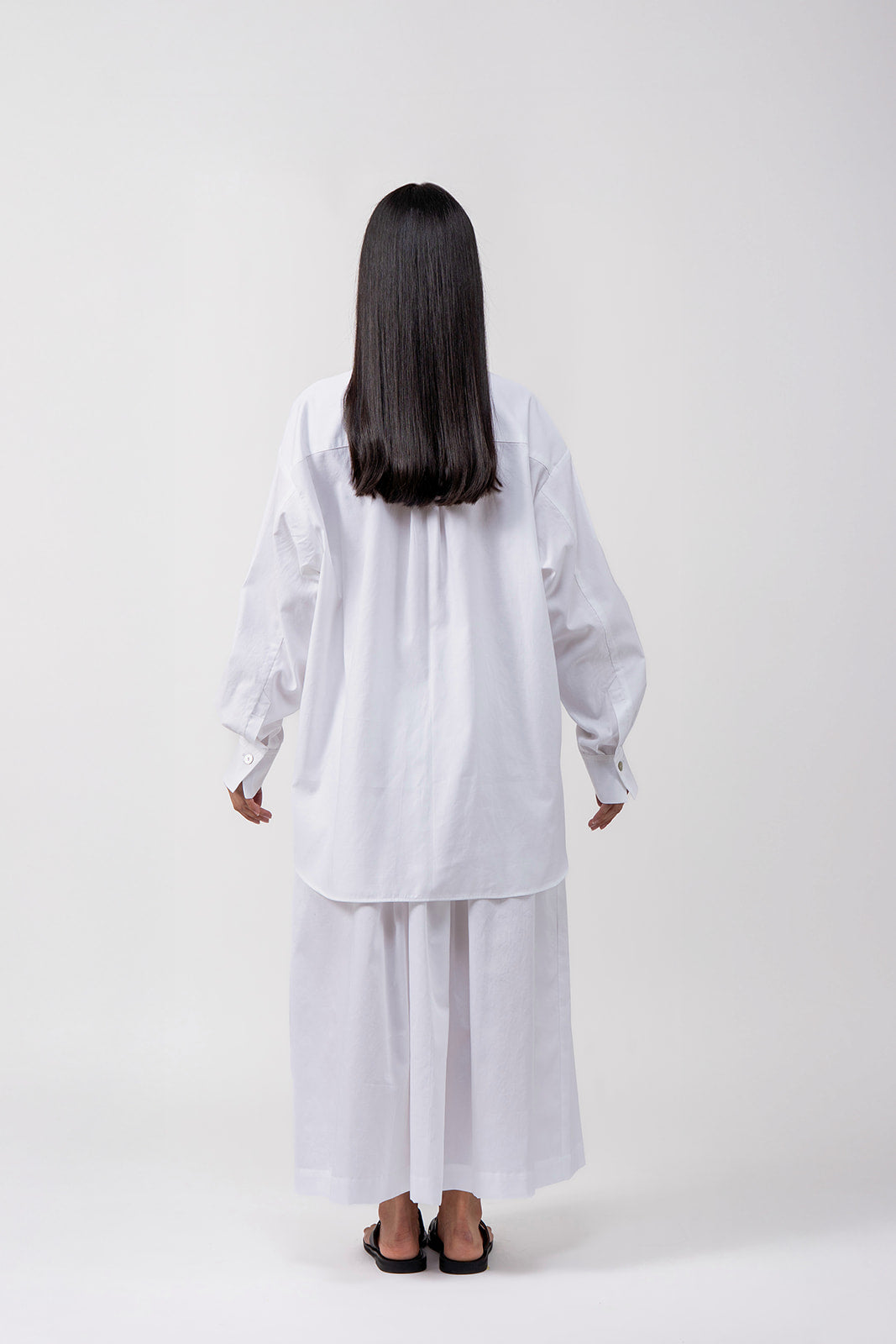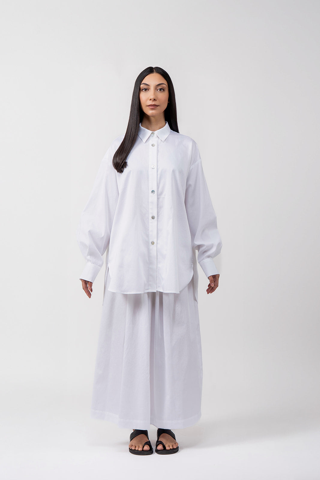 Tento set košile se sukní je ideální pro ty, kdo hledají sofistikovaný a pohodlný outfit. Košile s volným oversize střihem je vyrobena z luxusního bavlněného saténu, má dlouhé rukávy a zapínání na perleťové knoflíky. Sukně má délku je kotníkům, se širšími sklady, které dodávají celkovému vzhledu vzdušnost a eleganci. Tento set je dokonalý pro formálnější příležitosti, ale i pro každodenní nošení, kdy chcete vypadat elegantně a cítit se pohodlně.